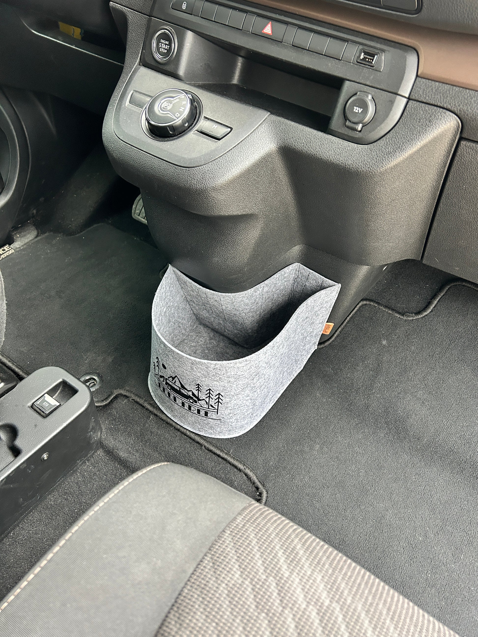 Die Arela Cockpitasche ist die Lösung! Diese handgefertigte Filztasche aus 3 mm dickem Filz und einer Antirutschmatte ist speziell für verschiedene Campervans geeignet. Sie wird mit Klebeklettbändern befestigt und kann jederzeit problemlos entfernt werden.