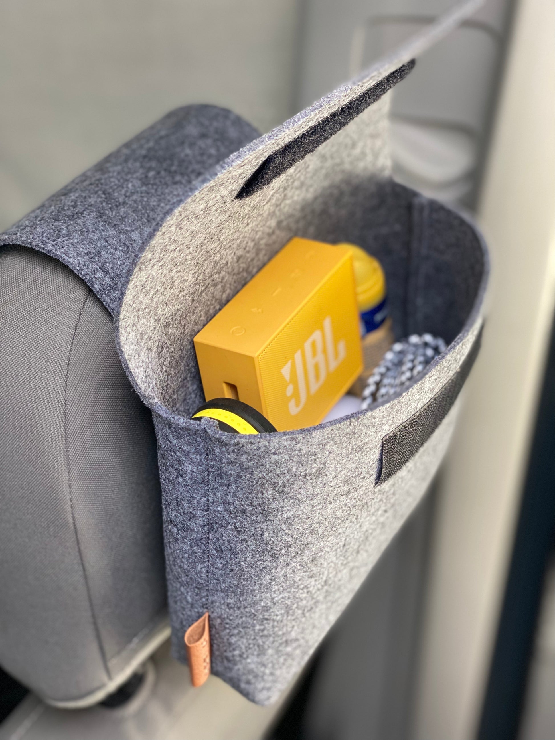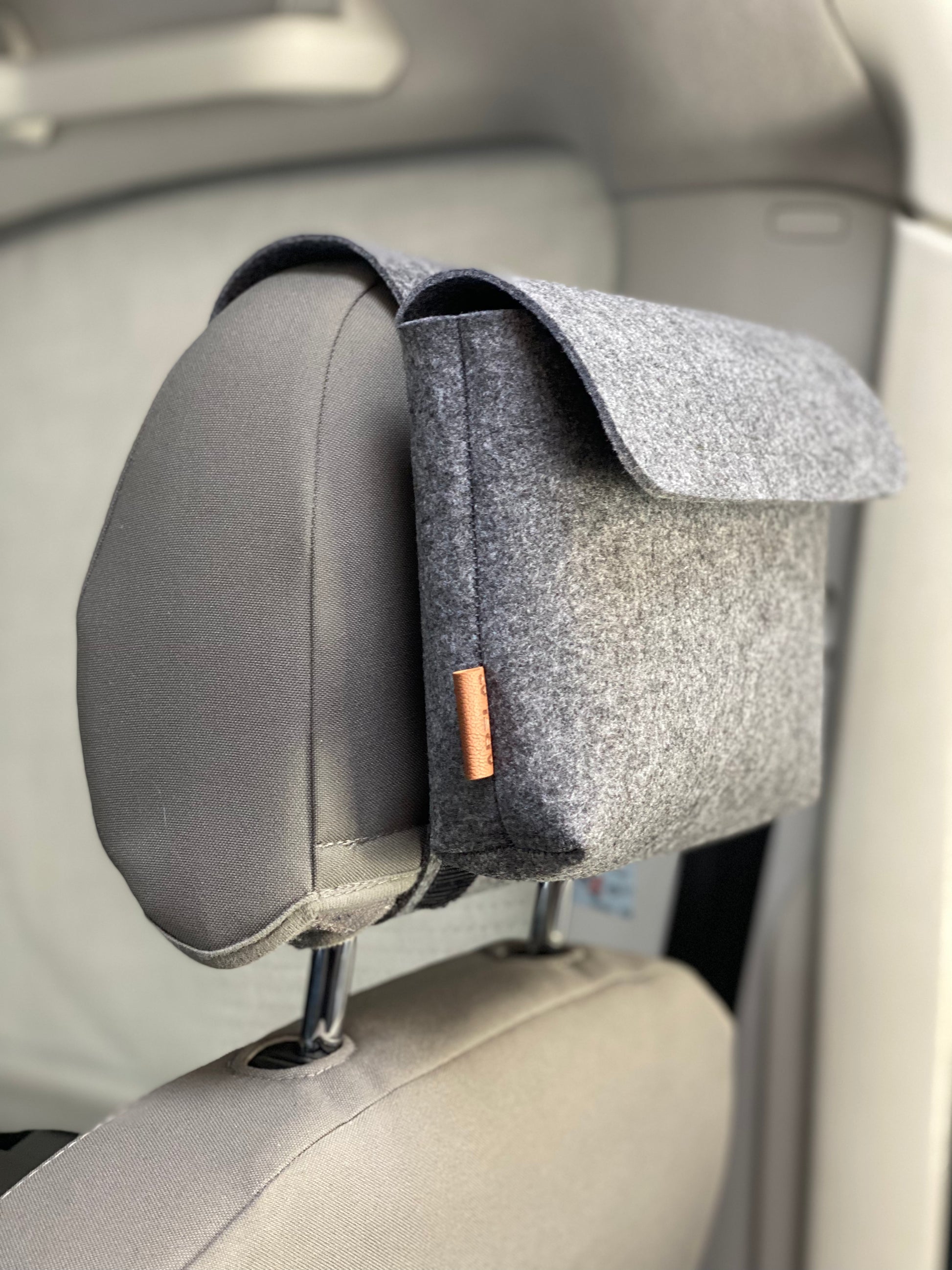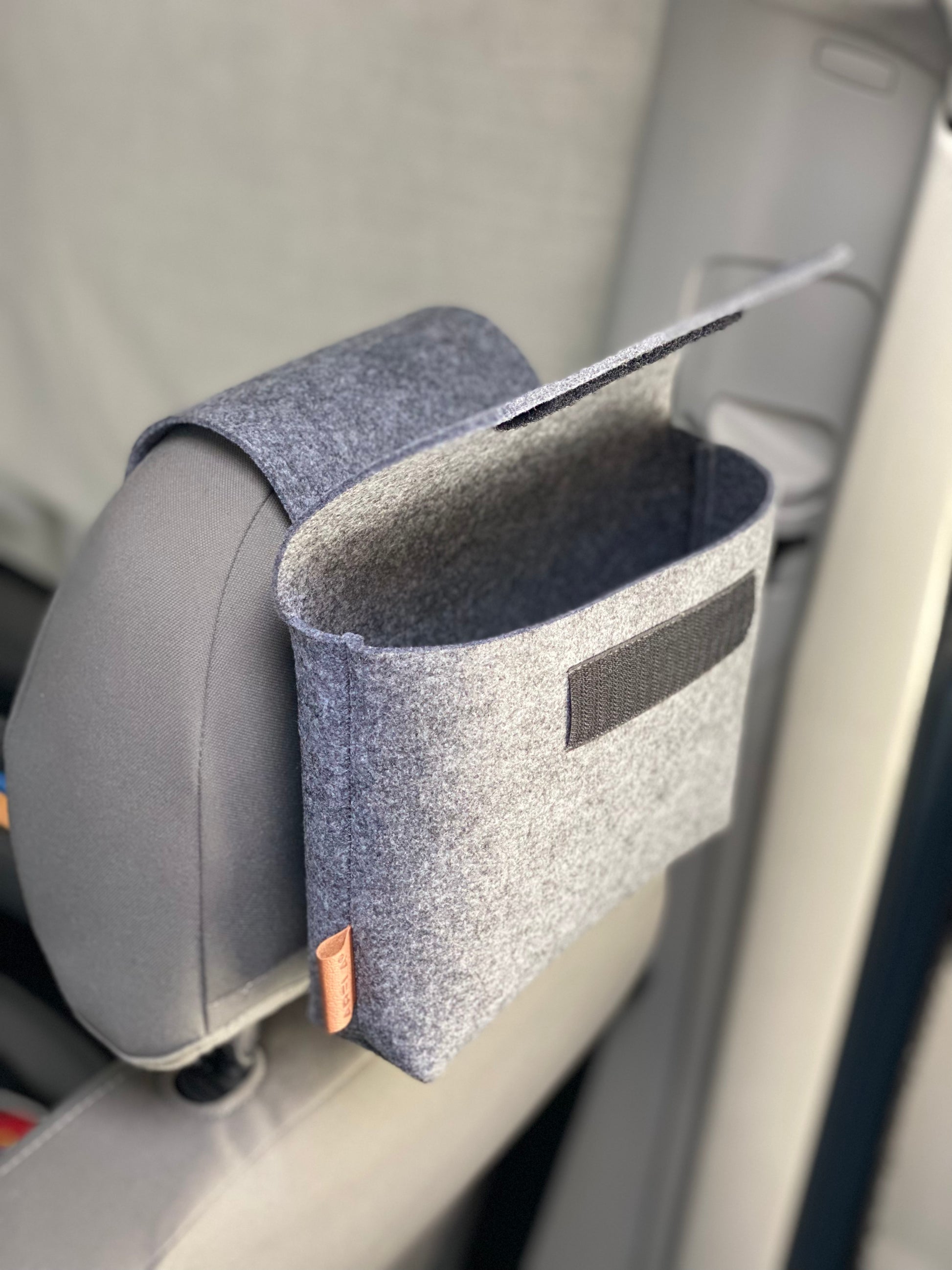 - Dank des cleveren Designs lässt sich die Filztasche mühelos an die Kopfstütze befestigen – kein Werkzeug erforderlich.