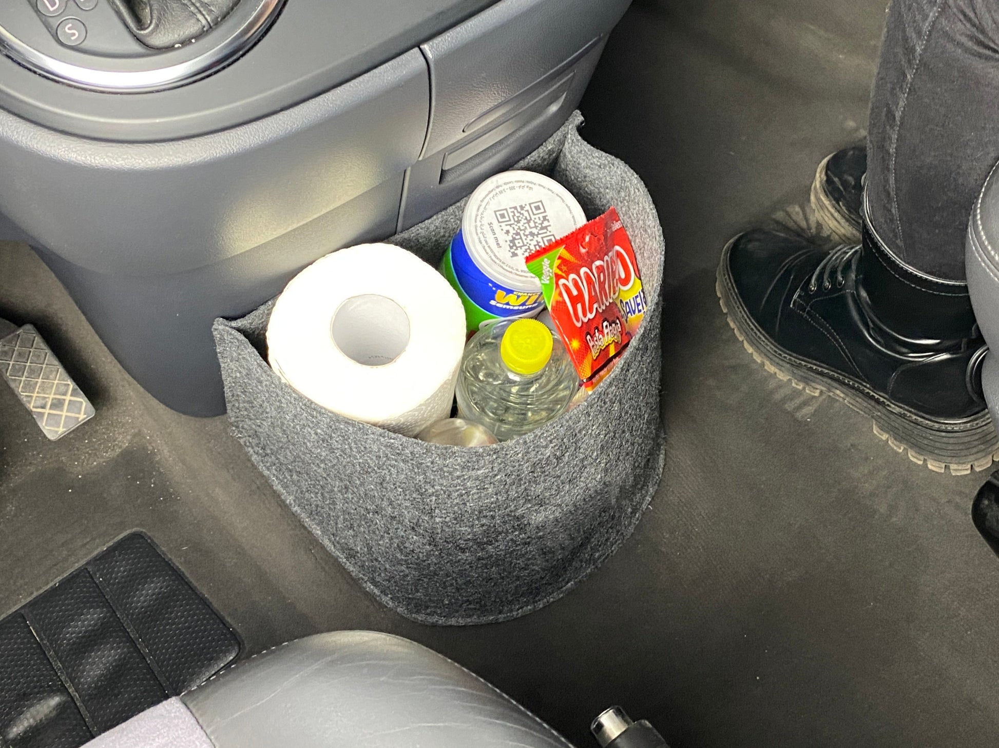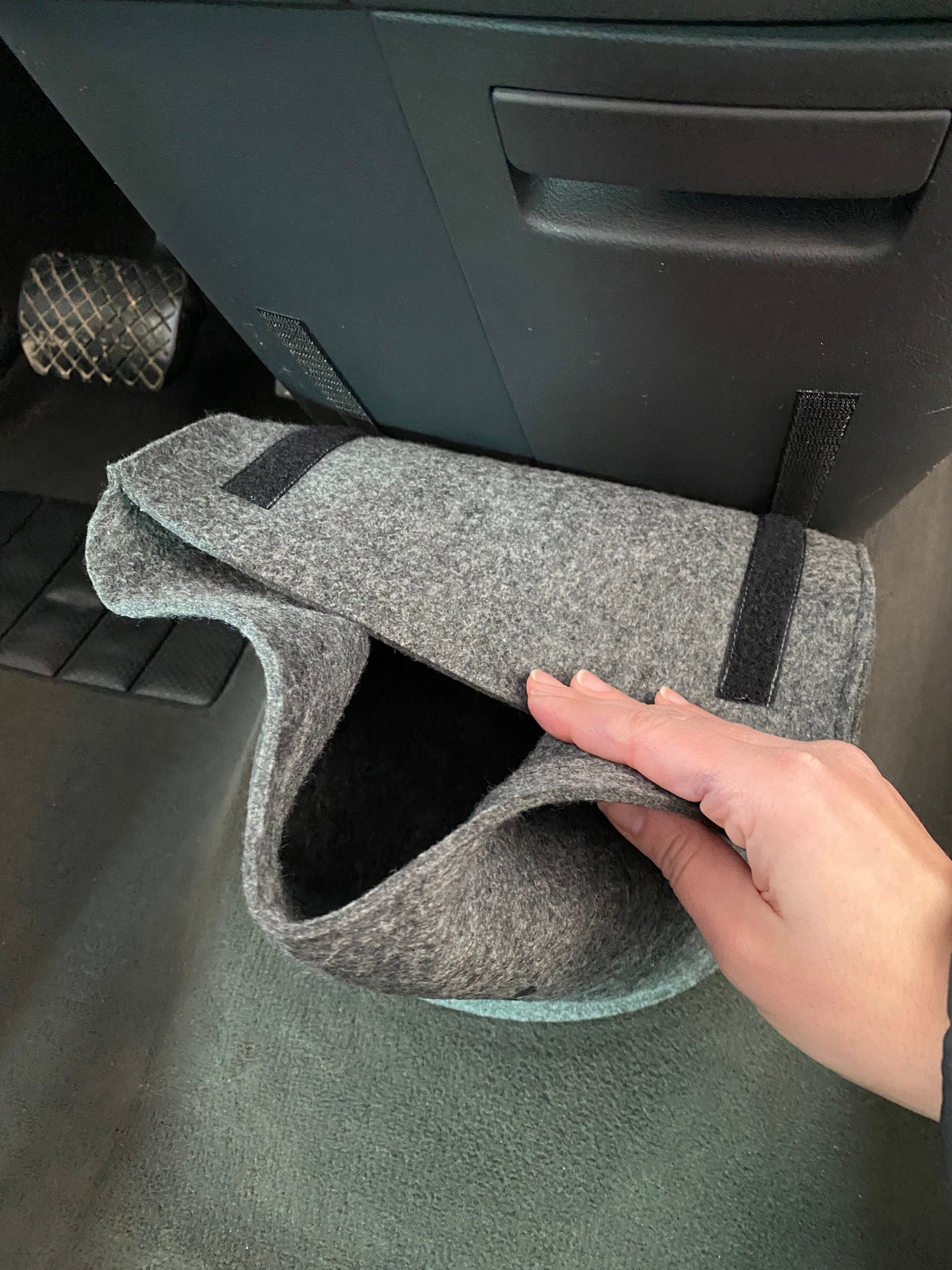 Die Arela Cockpitasche ist die Lösung! Diese handgefertigte Filztasche aus 3 mm dickem Filz und einer Antirutschmatte ist speziell für verschiedene Campervans geeignet. Sie wird mit Klebeklettbändern befestigt und kann jederzeit problemlos entfernt werden.