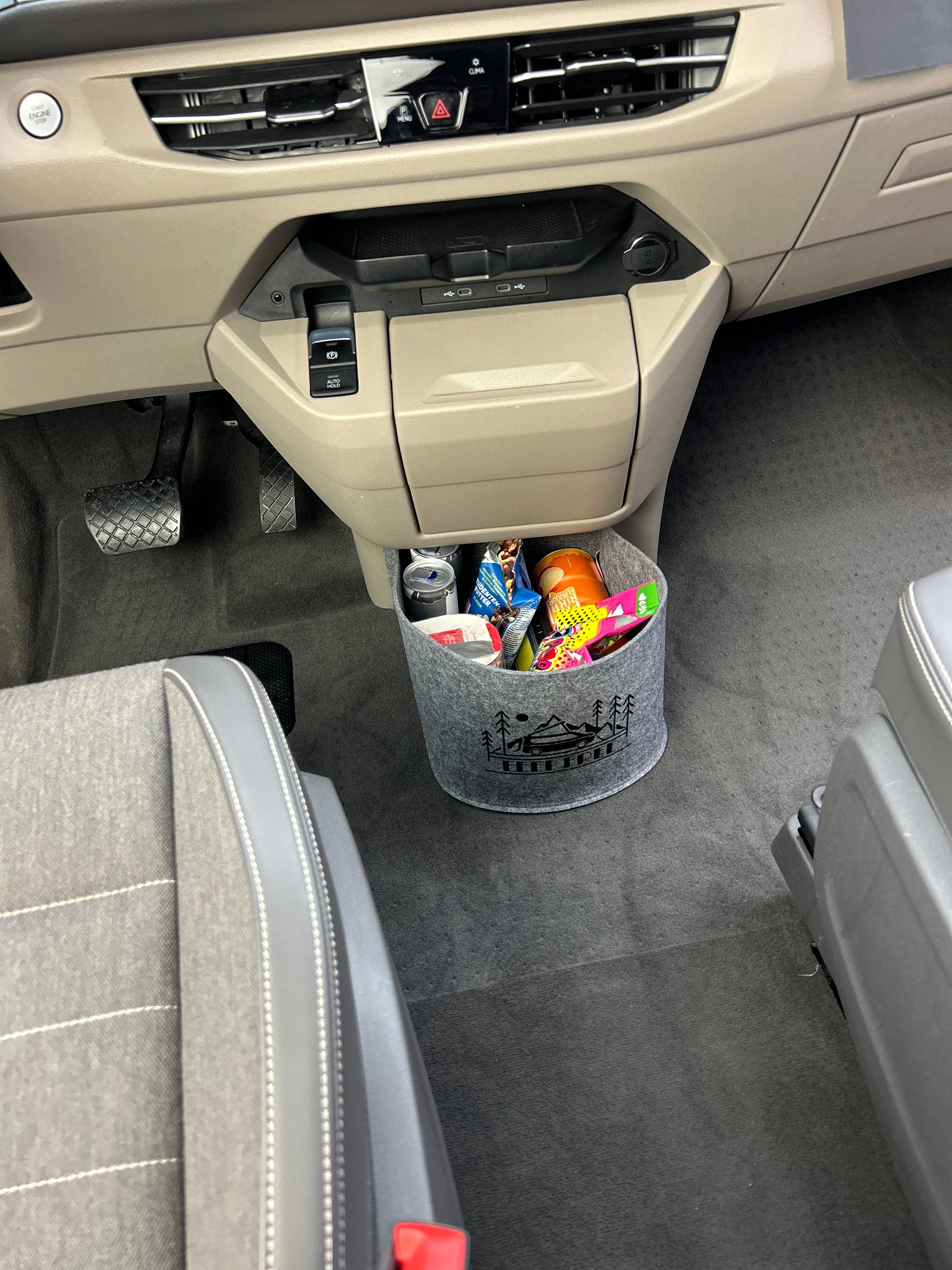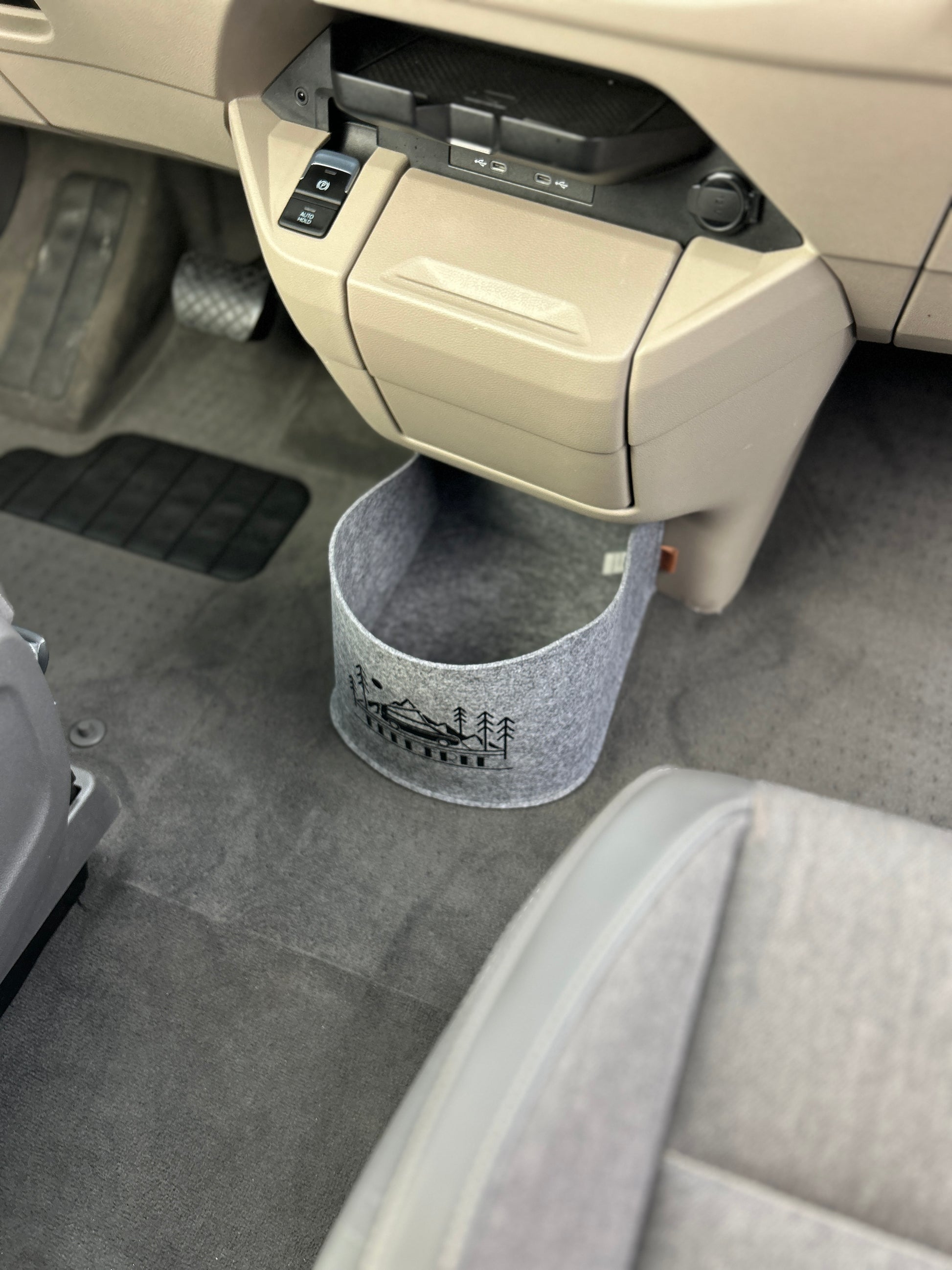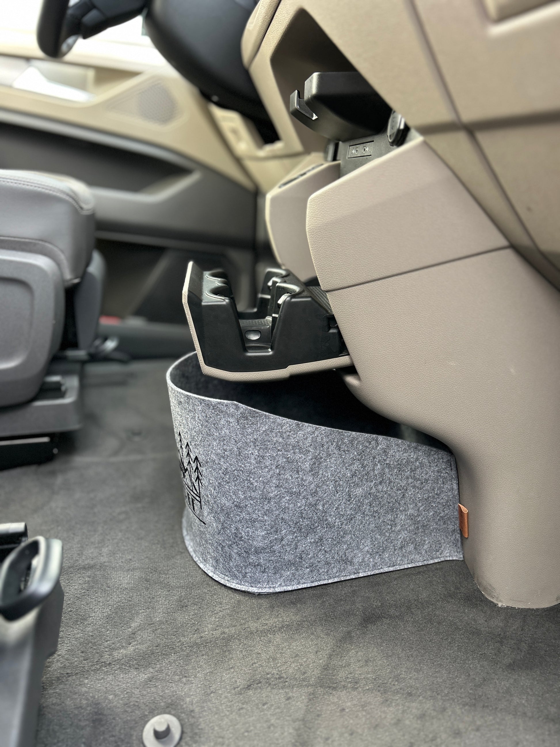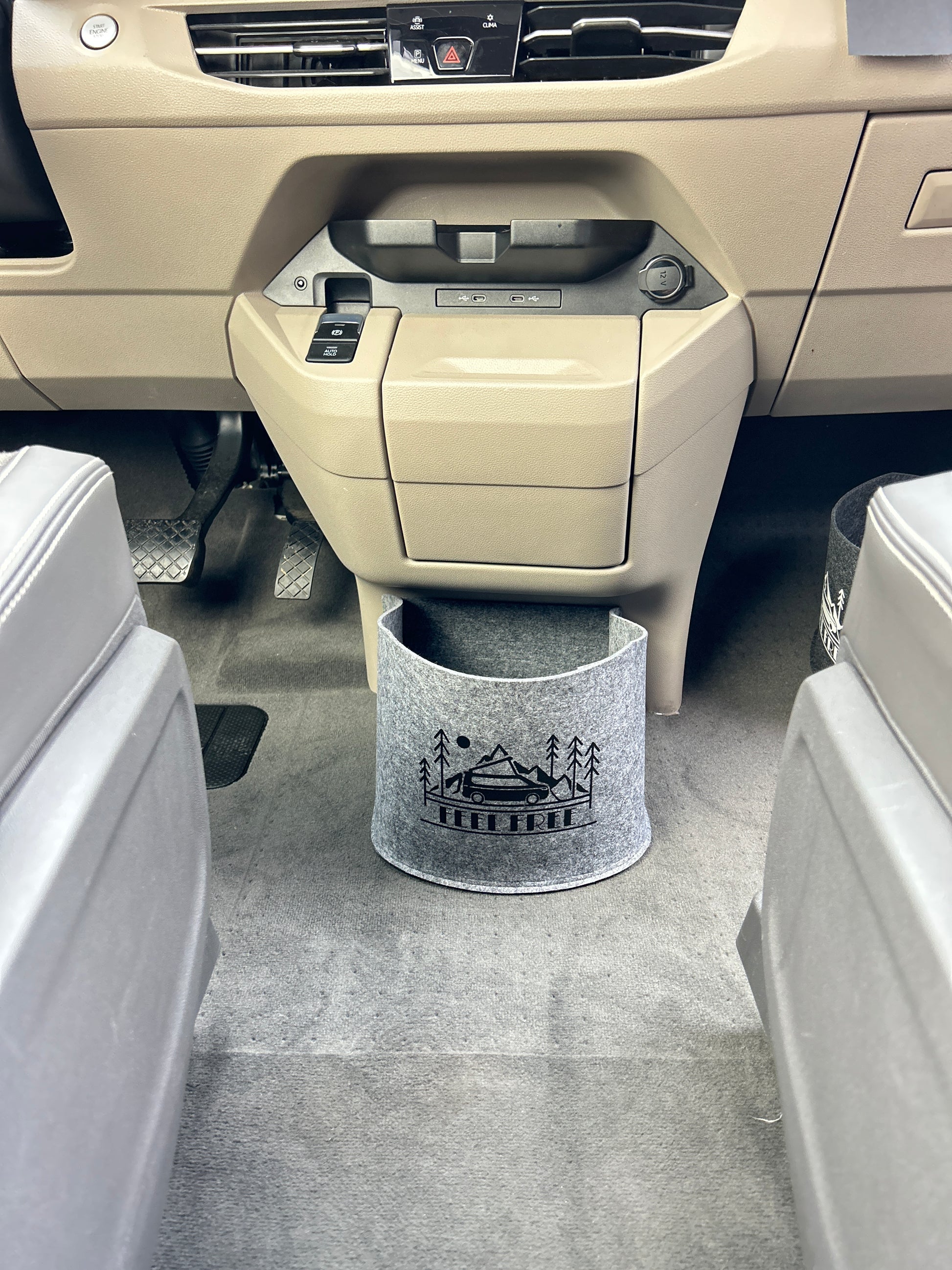 Die Arela Cockpitasche ist die Lösung! Diese handgefertigte Filztasche aus 3 mm dickem Filz und einer Antirutschmatte ist speziell für verschiedene Campervans geeignet. Sie wird mit Klebeklettbändern befestigt und kann jederzeit problemlos entfernt werden.